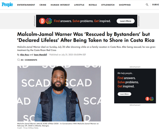 据美国《人物》杂志报道,现年54岁的好莱坞知名演员马尔科姆·贾马尔·华纳7月20日在哥斯达黎加度假期间溺水意外身亡。当时马尔科姆与家人在哥斯达黎加度假,他在海边被一股水流卷走,随后有旁观者将其救起带到海边。哥斯达黎加红十字会在岸边对其进行了救治,医护人员进行了20分钟的心肺复苏但是未能成功,他在现场被宣布死亡。