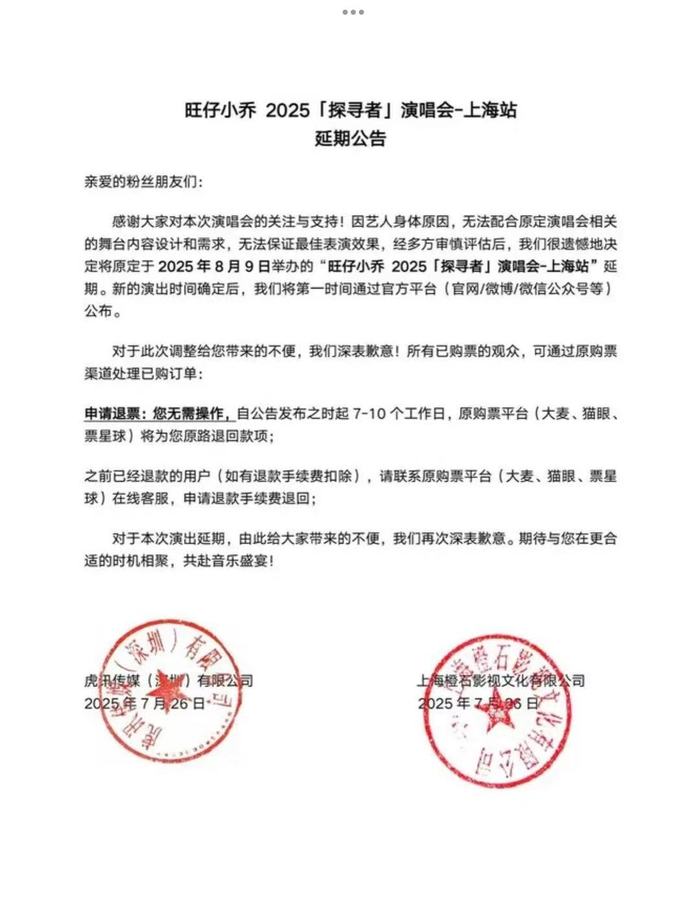 当晚,旺仔小乔演唱会主办方发布延期补偿公告。公告称,因艺人身体原因,无法配合原定演唱会相关的舞台内容设计和需求,无法保证最佳表演效果,经多方审慎评估后,决定将原定于2025年8月9日举办的“旺仔小乔2025「探寻者」演唱会-上海站”延期。新的演出时间确定后,将第一时间通过官方平台公布。