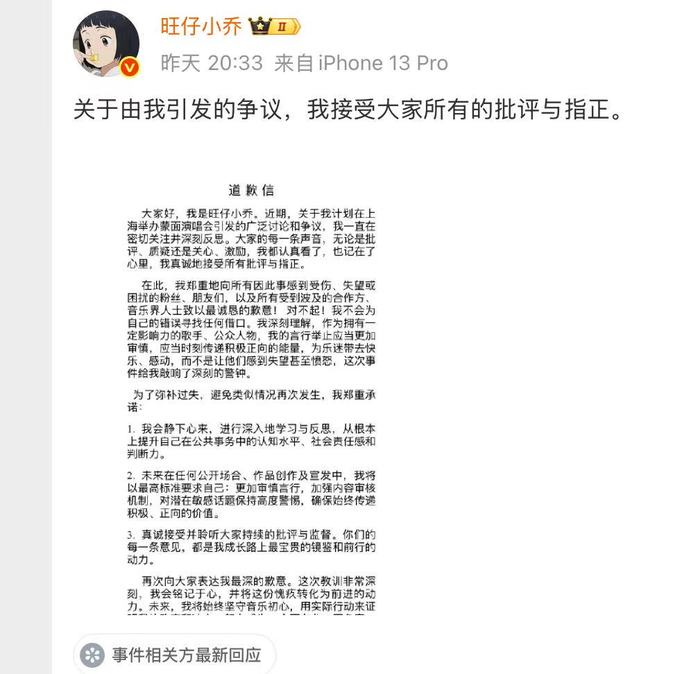 在道歉信中,旺仔小乔表示:近期,关于我计划在上海举办蒙面演唱会引发的广泛讨论和争议,我一直在密切关注并深刻反思。大家的每一条声音,无论是批评、质疑还是关心、激励,我都认真看了,也记在了心里,我真诚地接受所有批评与指正。