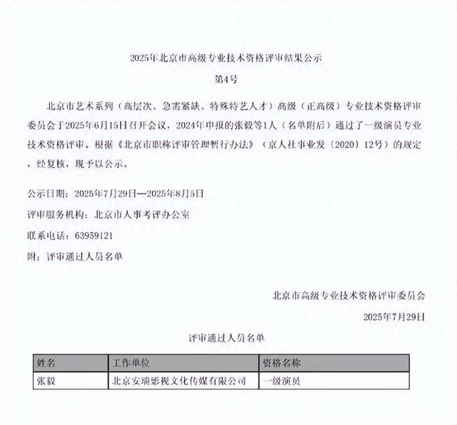 7月29日,北京市高级专业技术资格评审委员会发布公示,张译(公示名“张毅”)通过一级演员(正高级职称)专业技术资格评审。
