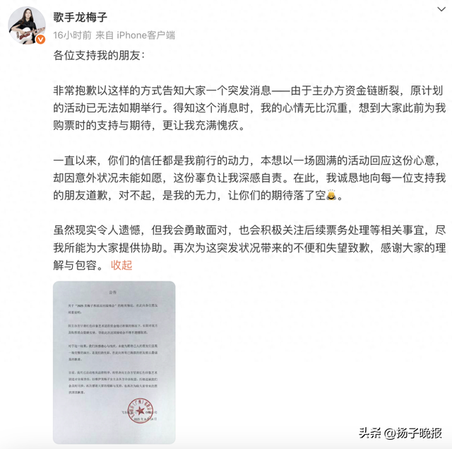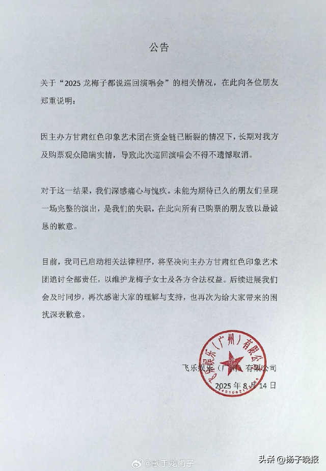 龙梅子发布的公告显示,“因主办方甘肃红色印象艺术团在资金链已断裂的情况下,长期对我方及购票观众隐瞒实情,导致此次巡回演唱会不得不遗憾取消,龙梅子方已启动相关法律程序,将坚决向主办方追讨全部责任,以维护龙梅子女士及各方合法权益。”