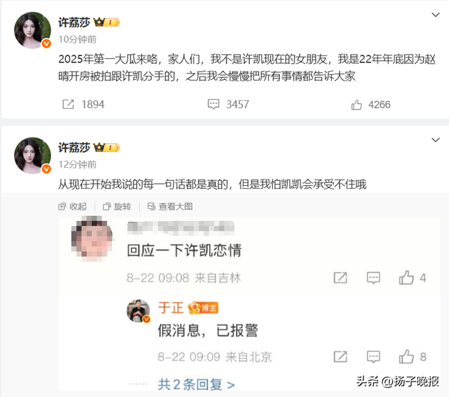 随后,恋情女主角@许荔莎 连发多条博文,自曝与许凯恋情,并喊话于正:“从现在开始我说的每一句话都是真的,但是我怕凯凯会承受不住哦 。”还表示自己不是许凯现在的女朋友,“我是22年年底因为赵晴开房被拍跟许凯分手的。”