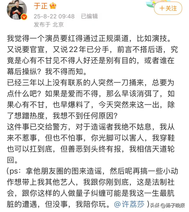 随后,于正再发文回应许荔莎: