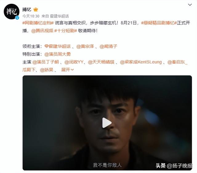 8月31日,由彭发执导,霍建华、黄宗泽、阚清子主演的24集悬疑短剧《搏忆》开启大结局点映。9月1日,主演与导演连麦直播感谢观众的支持,在《玫瑰的故事》之后再一次与观众重逢、前一天还因为在江蕙演唱会上与妻子林心如亲吻而上了热搜的霍建华,诚恳提到了接演《搏忆》的原因以及“一人分饰两角”的新体验。