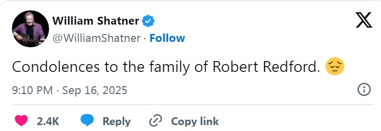 《星际迷航》系列的初代柯克船长扮演者威廉·夏特纳向雷德福的家人表示哀悼之情。