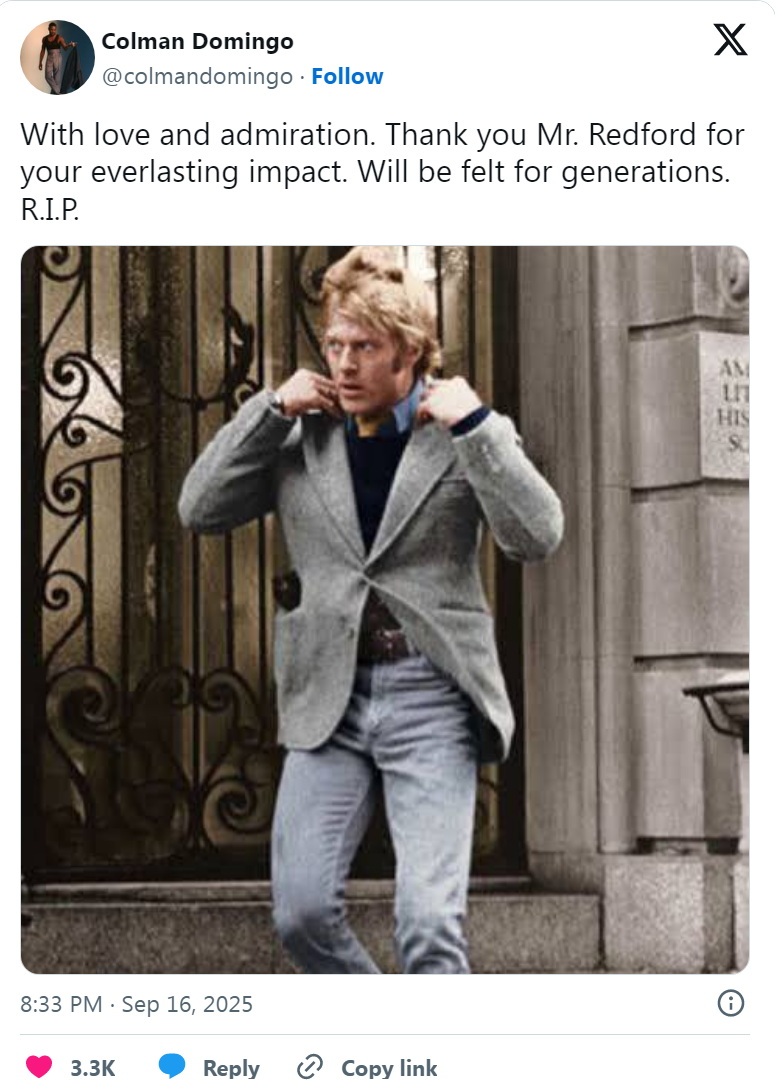 曾凭借《监狱剧院》获得奥斯卡提名的演员科尔曼·多明戈写道:“此刻我满怀爱与敬意。感谢雷德福先生给我们留下的永恒的影响。它将世代相传。愿您安息。”
