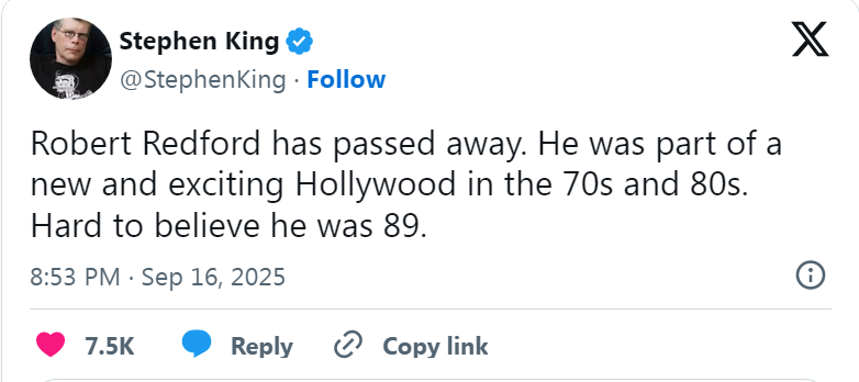 畅销书作家斯蒂芬·金发文称:“罗伯特·雷德福走了。他是1970年代到1980年代那个崭新且令人振奋的好莱坞的一部分。很难相信他已经89岁了。”