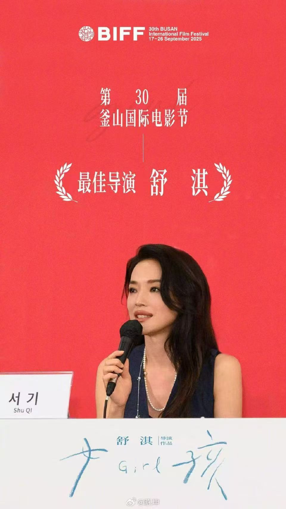 9月26日,演员舒淇凭借《女孩》拿下第30届釜山国际电影节最佳导演奖。《女孩》是舒淇的第一部导演作品,此前还入围了威尼斯电影节主竞赛单元。她在致辞中感谢了该片的主创团队、双亲以及丈夫冯德伦。