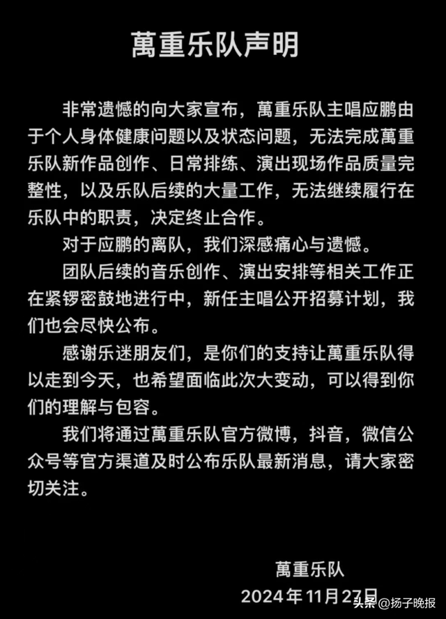 2024年11月,万重乐队曾发声明,称主唱应鹏因健康问题,无法完成乐队工作,双方决定终止合作。