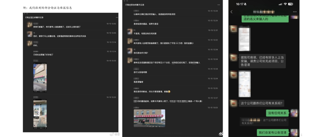 其发布的图片显示,有网友反映称一名为“森林北生态国际酒店”的项目“有五六个分店,有的店已经烂尾了,还在骗人”。