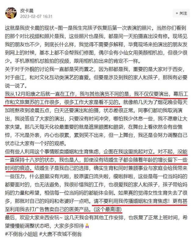 冯佳晨回应称,阳康后为了工作,有时加班熬夜到凌晨五点,白天还要演出和拍摄,状态差很正常,但有些人利用这个事情,贩卖婚姻和生育焦虑,甚至被用来打广告卖医美产品。她表示,结婚和生育是自己的选择,不想被利用,来传播婚姻和生育焦虑。