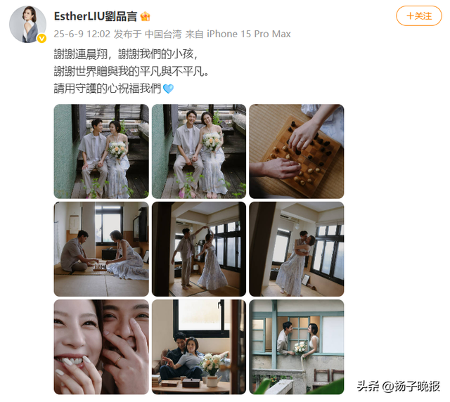 刘品言写道:谢谢连晨翔,谢谢我们的小孩,谢谢世界赠与我的平凡与不平凡。请用守护的心祝福我们。