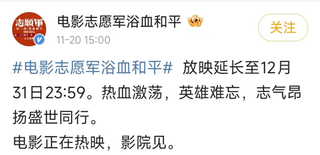 11月20日,电影《志愿军:浴血和平》官微宣布将放映延长至12月31日23:59。