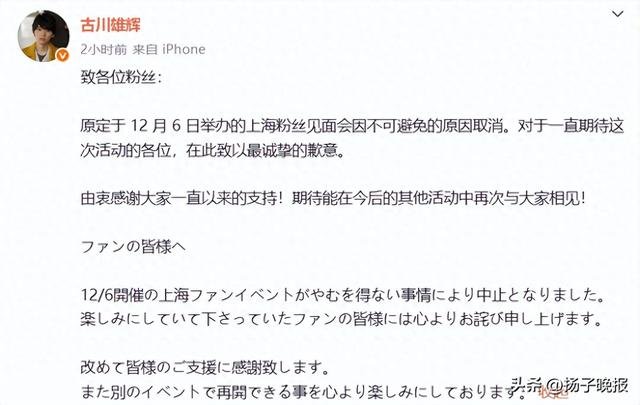 11月20日,日本演员古川雄辉在微博发文确定粉丝见面会取消,向大家致歉。其发文如下: