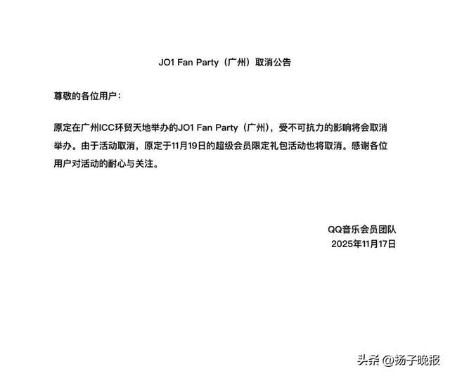 17日晚,QQ音乐在社交网站上发布一则公告称:“原定在广州举办的JO1 Fan Party,受不可抗力的影响将会取消举办。”