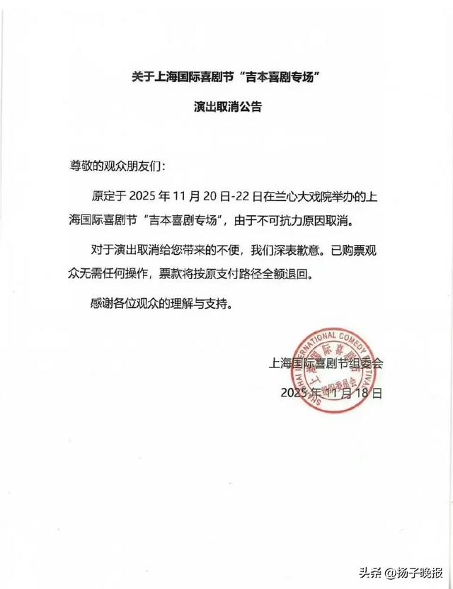 据上海国际喜剧节官方微信公众号,原定于2025年11月20日-22日在兰心大戏院举办的上海国际喜剧节“吉本喜剧专场”,由于不可抗力原因取消。