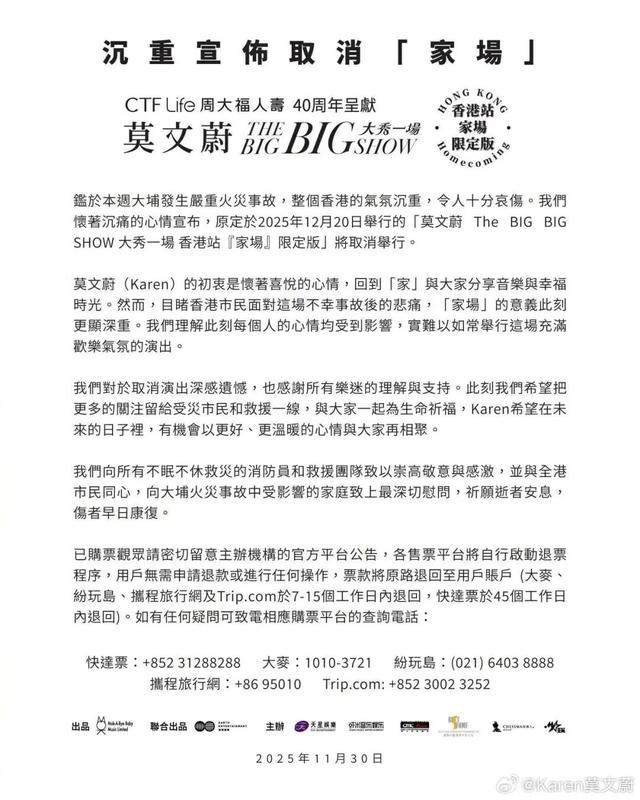 11月30日,歌手莫文蔚在社交平台宣布,鉴于本周大埔发生严重火灾事故,令人十分哀伤,原定于2025年12月20日举行的演唱会取消。