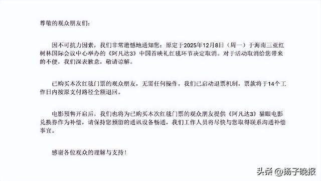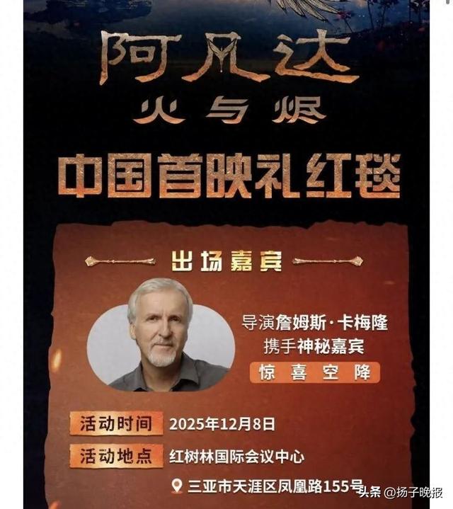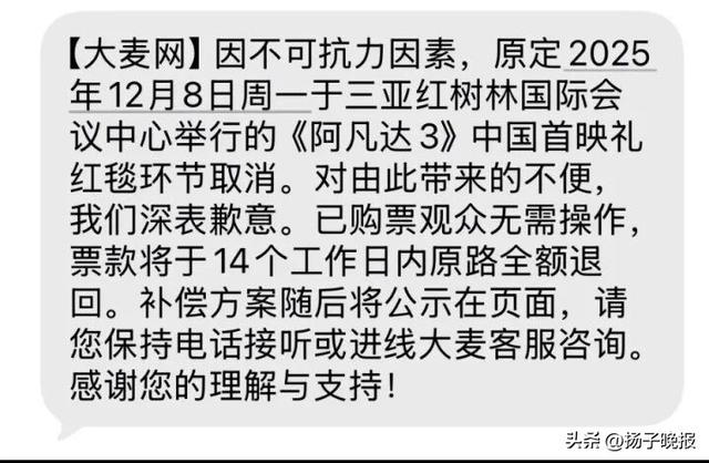 《阿凡达:火与烬》(《阿凡达3》)中国首映礼,原计划作为第七届海南岛国际电影节特别活动于12月8日在三亚举行,导演詹姆斯·卡梅隆也将惊喜现身。但有网友表示今日收到了红毯活动取消的邮件通知:“因不可抗力因素,我们非常遗憾地通知您:原定于2025年12月8日(周一)于海南三亚红树林国际会议中心举办的《阿凡达3》中国首映礼红毯环节决定取消。对于活动取消给您带来的不便,我们深表歉意,敬请谅解。”