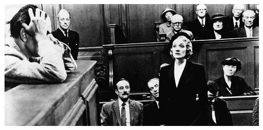 沃尔扮演者泰隆·鲍华将这部作品化作演艺生涯的完美谢幕,他以极具说服力的表演,完成了从深情款款到奸诈狡猾的无缝转变,让观众彻底沉浸在角色构建的悬念漩涡中。“中性美代言人”玛琳·黛德丽则精彩诠释了女主角克里斯汀。值得一提的是,她在出演这部电影时已经56岁,但状态奇佳,以法庭为舞台,在“好演员”和“好妻子”的状态中切换自如,正是她细腻入微的表演将电影的悬念留存到了最后一刻,并在揭晓时带给观众最大震撼。