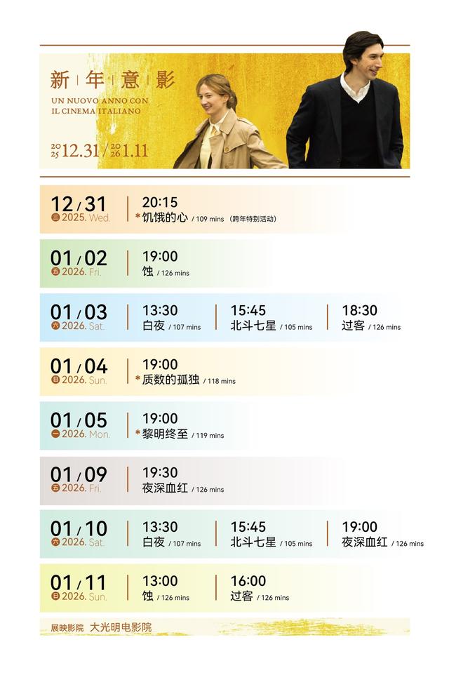 新年意影海报此外,电影大师达里奥·阿基多执导,讲述英国钢琴家来到罗马却意外卷入一宗杀人事件的经典《夜深血红》,其中音乐由前卫摇滚乐队哥布林配乐;电影大师维斯康蒂与马斯楚安尼的转型代表作之一《白夜》,故事根据陀思妥耶夫斯基作品改编,讲述一位年轻的女士在等待一年的爱情诺言与三晚的一见钟情间的纠结故事。同样来自维斯康蒂的,还有其转型期的代表作之一《北斗七星》。由银幕女神克劳迪娅·卡汀娜主演,讲述一位名叫桑德拉的女士因回到祖宅而引出的不可告人的家庭秘密故事。