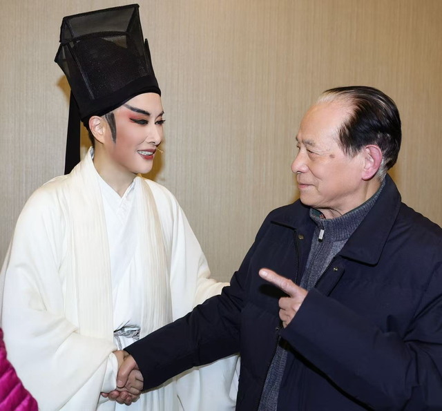 93岁作曲家何占豪在后台和茅威涛合影