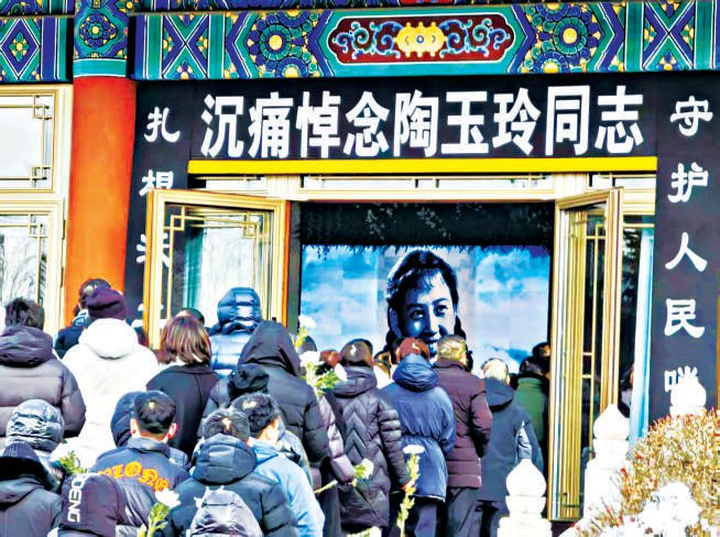 东礼堂外的横幅上写着:沉痛悼念陶玉玲同志。两侧挽联分别是:守护人民哨兵永在;扎根沃土柳堡长青。告别仪式现场气氛庄重而温暖,两侧显示屏上播放的是《柳堡的故事》的多幅剧照,陶玉玲的遗体安卧在鲜花之中,身上覆盖着鲜红的中国共产党党旗,这是对她70年党龄的致敬。