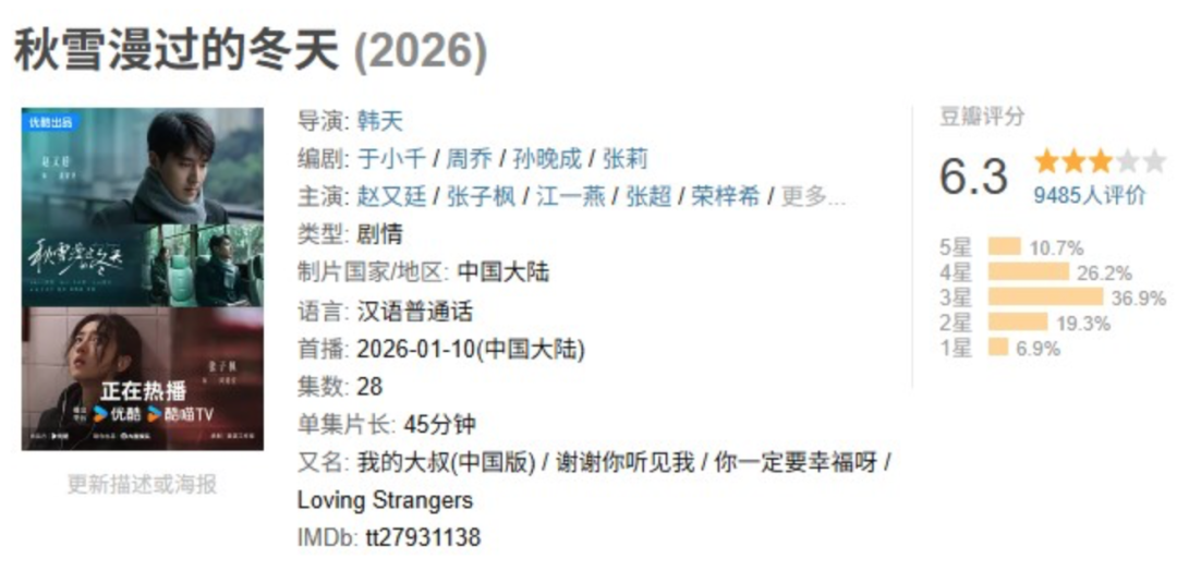 二者的差距确实明显。评分网站上,《我的大叔》高达9.4分,而《秋雪漫过的冬天》一直拖到快收官才开分:6.3分(截至发稿前该剧豆瓣评分6.7分)。