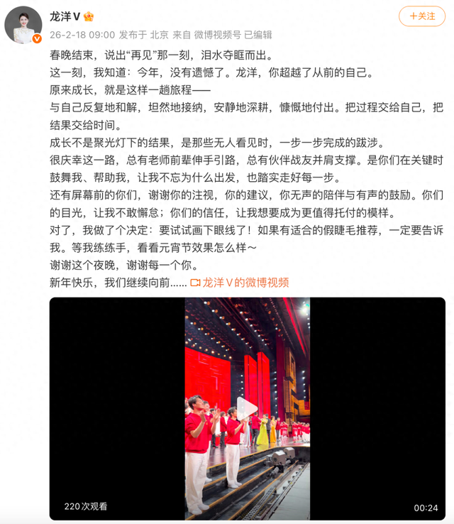 2月18日,2026年央视春晚北京主会场主持人龙洋发文: