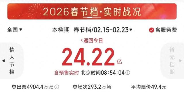 据猫眼专业版数据,截至2月19日八点五十四分,2026年春节档电影总票房(含预售)突破24.22亿元!怀柔影企出品电影《飞驰人生3》《惊蛰无声》《熊出没·年年有熊》分列前三位。