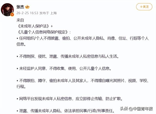 随后,其丈夫、歌手张杰发布未成年人保护法和《儿童个人信息网络保护规定》相关内容,其中提到“不得跟拍、蹲守、偷拍未成年人及其家人,不得擅自曝光其照片、视频、学校、行程”等。