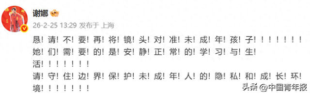 同日下午,谢娜在社交平台发文,并用了68个感叹号:恳请不要再将镜头对准未成年孩子!她们需要的是安静正常的学习与生活!请守住边界保护未成年人的隐私和成长环境!