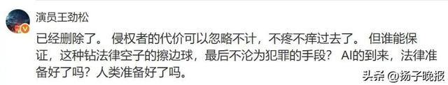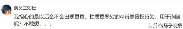王劲松在评论区与网友交流,“我家里人都分不清是不是真是我了,我担心的是以后会不会出现更真、性质更恶劣的AI肖像侵权行为,用于诈骗呢?不敢想……”