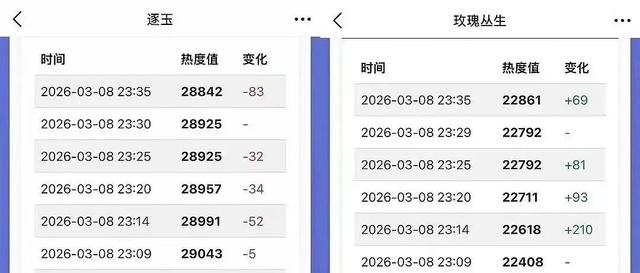 有网友发现平台改了热度计算规则,只要点一下就算看完。这一发现又让刘宇宁的粉丝连夜下场“喝汤”,为同档期的《玫瑰丛生》手搓热度。别说还真有效,带动《玫瑰丛生》热度从第11名升至第6名。