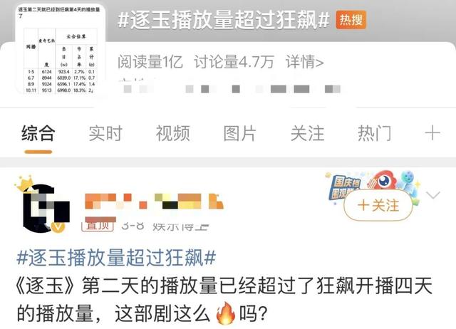 据统计,《逐玉》开播第二天就已经超过了《狂飙》开播四天的播放量,爆款无疑。