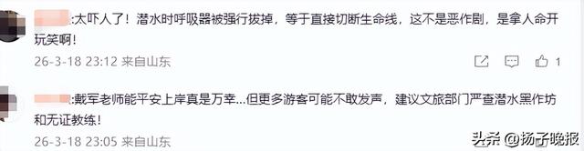对此,不少网友表示潜水项目类似乱象频发,有网友说:“水下缺乏取证条件,事后维权成功率极低,游客需以事前防范为首要原则,也有网友说:“太吓人了!潜水时呼吸器被强行拔掉,等于直接切断生命线,这不是恶作剧,是拿人命开玩笑啊!”