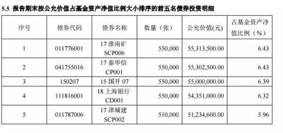 wind数据显示,截至2018年一季度末,光大中高等级债券A/C的前五大持仓债券分别是17津城建SCP002、17泰华信CP001、15国开07、18上海银行CD001、17津城建SCP002,合计持仓占比为31.53%。