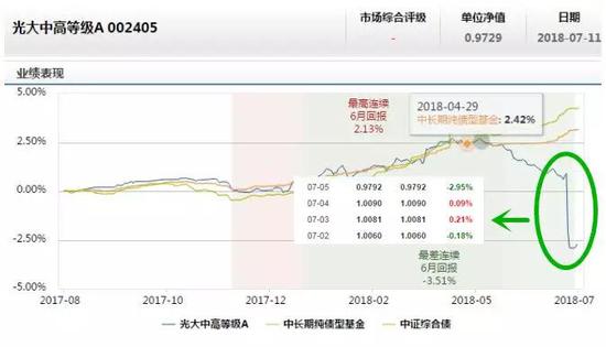 这事儿最近就发生在了光大保德信旗下的债券基金,光大中高等级债券A/C,在7月5日的净值跌幅达到2.95%,这对于一只风格稳健的中长期纯债来说,是极为罕见的现象。