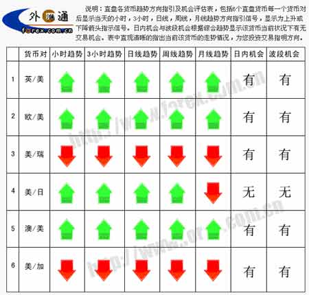 ![]() 说明:直盘各货币趋势方向指引及机会评估表,包括6个直盘货币对,每一个货币对后显示当天的小时,3小时,日线,周线,月线趋势方向指引信号,显示为上升或下降箭头指示信号。日内机会与波段机会根据综合趋势显示该货币当前状况下有无交易机会。表中直观清晰的指出当前该货币的走势情况,为您投资交易指明方向。 新浪声明:本版文章内容纯属作者个人观点,仅供投资者参考,并不构成投资建议。投资者据此操作,风险自担。