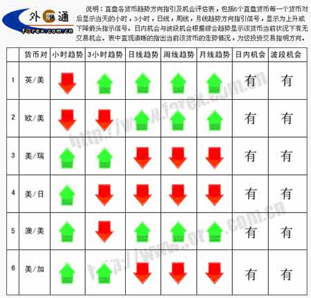 ![]() 说明:直盘各货币趋势方向指引及机会评估表,包括6个直盘货币对,每一个货币对后显示当天的小时,3小时,日线,周线,月线趋势方向指引信号,显示为上升或下降箭头指示信号。日内机会与波段机会根据综合趋势显示该货币当前状况下有无交易机会。表中直观清晰的指出当前该货币的走势情况,为您投资交易指明方向。 新浪声明:本版文章内容纯属作者个人观点,仅供投资者参考,并不构成投资建议。投资者据此操作,风险自担。