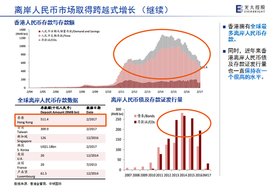 这张图是这几年离岸人民币市场的规模,尽管2015年股灾以后,离岸人民币市场整个池子在缩小,但是离岸人民币市场存款量,在所有国家和地区来说,香港一直保持着比较优势的地位,到去年年末是5100多亿的规模。而且我们要看到另外一个数字,这几年离岸人民币债券发行量在不断上升,尤其是2013年、2014年、2015年这几年的量到了相当大的规模,达到2000多亿甚至达到2500多亿的规模。