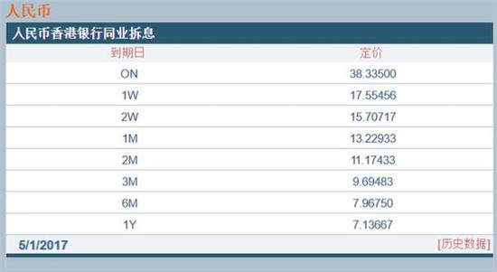 2、HIBOR的人民币拆借利率。下图是1月5日的最近报价,隔夜利率竟然达到了吓人的38.335%!!!!即使是1个月利率,也是13.23%的吓死人高水平。