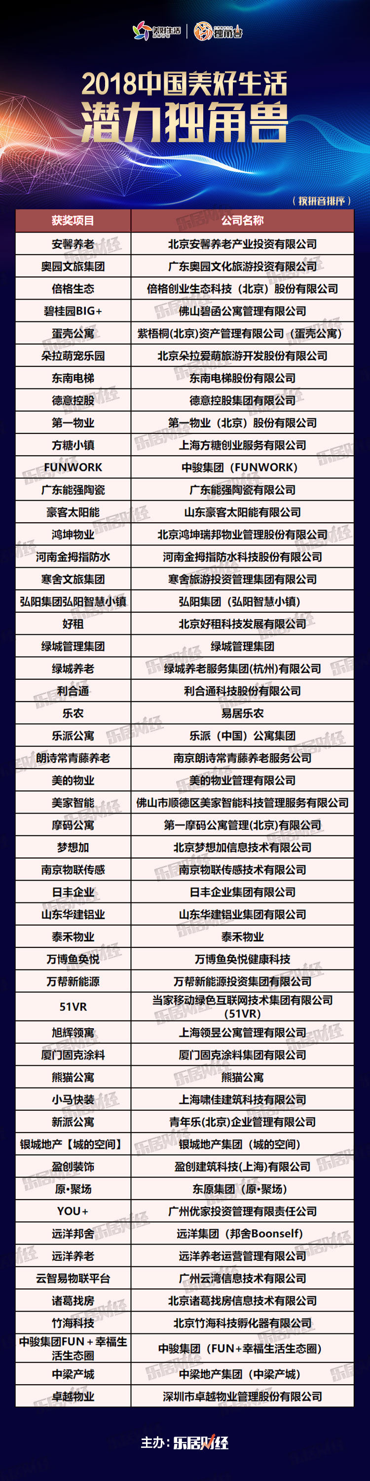 乐居财经讯 9月6日,由乐居财经主办的2018乐居财经年度论坛暨发现美好生活独角兽峰会,在北京中国大饭店隆重举行。论坛聚焦房地产+全域创新盘点,超100家潜力独角兽企业参会,近100家资本机构和行业专家到场互动。现场,52家2018中国美好生活“潜力独角兽”企业及项目名单正式公布。