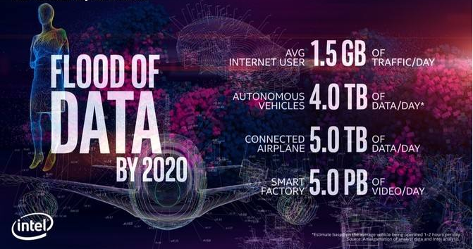 他表示,截至2020年,每人每天平均将产生1.5GB的数据量,是现在每人产生的数据量的两倍;但相比无人车每天产生的4T数据量,这还是少的。4T数据量相当于每人每天产生数据量的2500倍。联网飞机每天产生约40TB的数据量;一家小型工厂每天能产生高达1PB的数据,这相当于70万人产生的数据量。