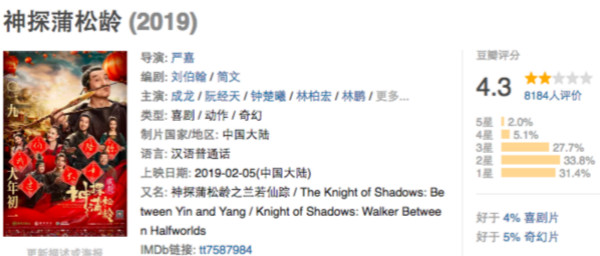 可是这张脸竟然直接卖不动了。想来有种英雄迟暮的伤感。曾经成龙的贺岁喜剧是贺岁的“标配”,从《大兵小将》《十二生肖》《新警察故事》《天降雄狮》《功夫瑜伽》这么一路走来,虽然成龙电影的评价这些年一直不高,但票房始终不差。《神探蒲松龄》这个不太出力气的“卖脸”确实让人产生“圈钱”的尴尬。网络上大量的“一星”差评也来自于此。但反过来想,成龙已经65岁,因为他不再是曾经硬桥硬马的Jackie Chan而失望,是不是有点太苛求了?