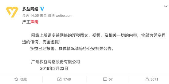 随后多益网络在其官方网站发布声明称,网络上所谓多益网络的淫秽图文、视频,及相关一切的内容,全部为凭空捏造的诽谤,完全虚假。