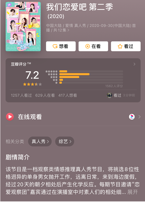 综艺方面,《我们恋爱吧2》以恋爱交友的形式,展现当代年轻人真实的生活、情感状态。郑爽、伊能静、黄圣依等不同年龄段女性解读,也是一大看点。对女性情感的深入洞察,引发网友共鸣,“这微妙的氛围,太刺激了”,豆瓣高赞评论说。目前该综艺豆瓣评分高达7.2,远超同期同类综艺。优酷数据显示,综艺女性用户粘性极强,《恋爱吧2》女性用户占比超70%,《火星5》女性用户占比超60%,这也是优酷精心打造女性生活排播带的体现。