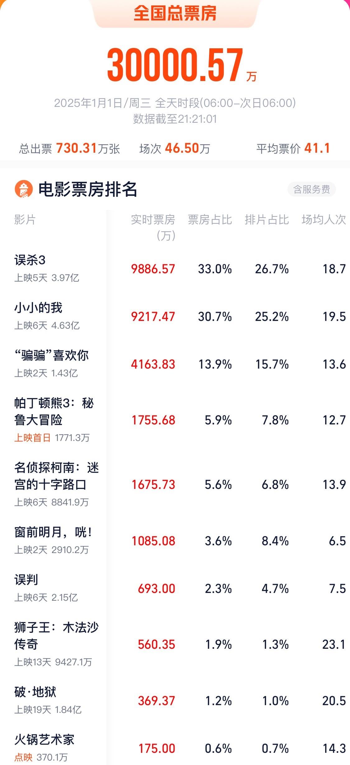 据网络平台数据显示,截至1月1日21时21分,2025元旦档(1月1日)票房突破3亿元。