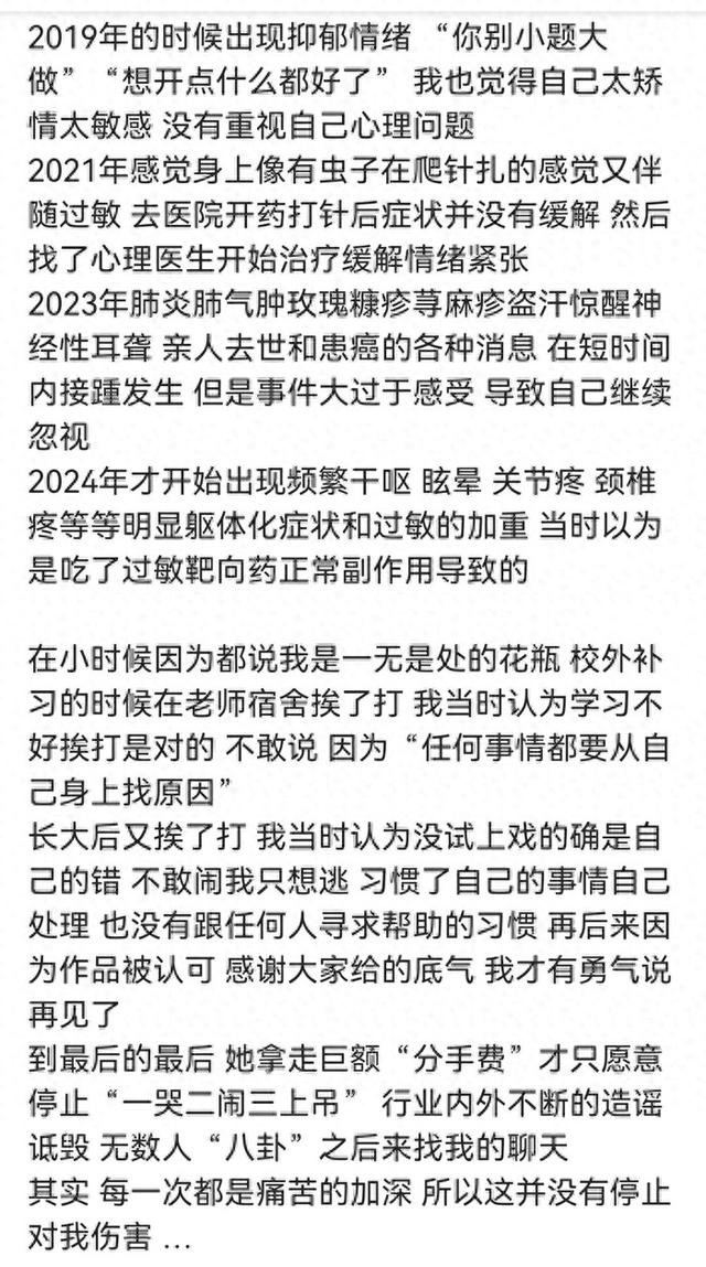 长文中,赵露思承认曾经被打,“长大后又挨了打,我当时认为没试上戏的确是自己的错,不敢闹我只想逃,习惯了自己的事情自己处理,也没有跟任何人寻求帮助的习惯,再后来因为作品被认可,感谢大家给的底气,我才有勇气说再见了。”此外,她还提到了一起“巨额分手费”事件,“到最后的最后,她拿走巨额‘分手费’才只愿意停止‘一哭二闹三上吊’。”