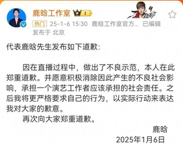 其工作室6日代表鹿晗发布如下道歉: