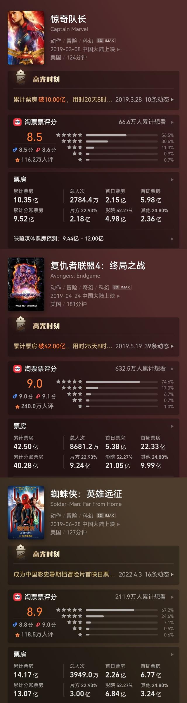 在2019年,漫威仅凭借《惊奇队长1》、新版《蜘蛛侠2》和《复联4》就在国内拿下67.02亿的票房